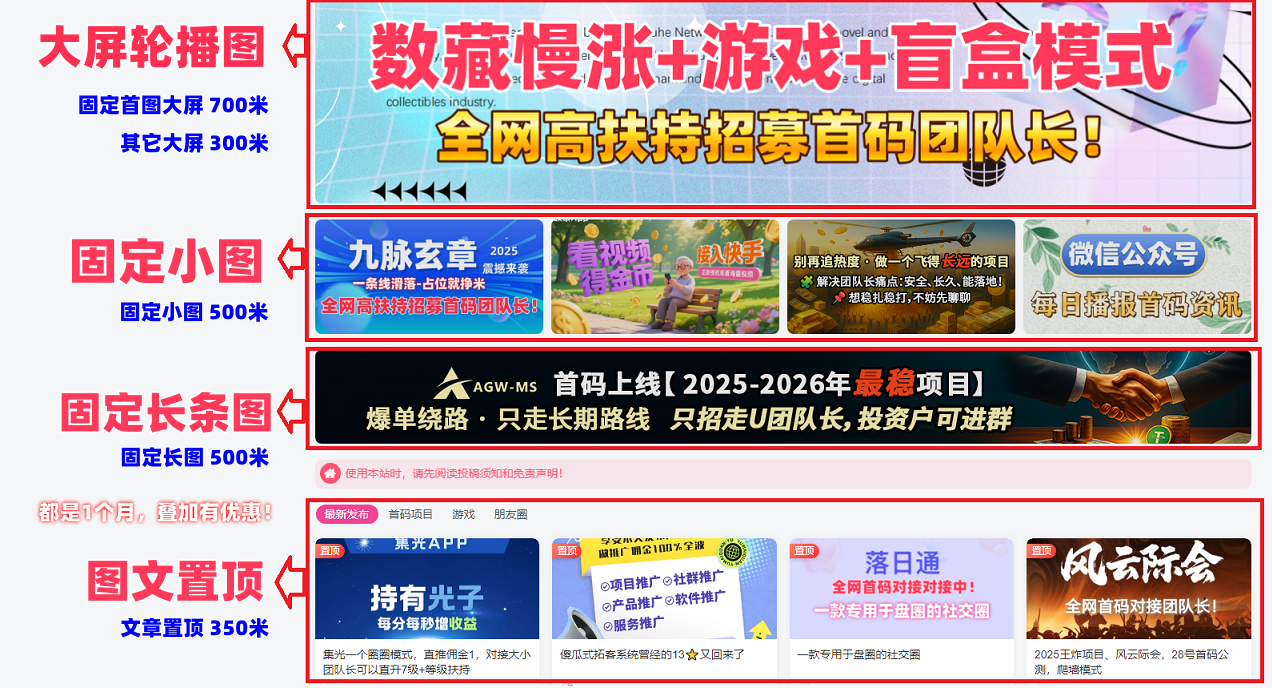 套餐四:大屏轮播图+固定小卡片+固定长条图+图文置顶30日 原价1650-优惠价1200